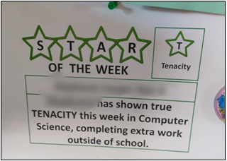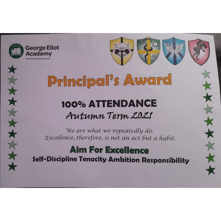 Despite the Principle Award being the most elite award a student can win, there are also many other awards that students can receive to celebrate their progress and hard work. These awards include: house merits, competition certificates, enrichment awards, STAR of the week awards, special mentions on Twitter and the school bulletin, and attendance awards. House merits are awarded several times in a lesson for good conduct, behaviour, and effort, and for those students who meet the schools’ expectations of SLANT (sit up straight; listen; answer questions; never interrupt; track the teacher). House merits can also be awarded outside of lessons for achievements there too. The STAR of the week award is given to students in each subject every week. This award is given to students who display the STAR values of George Eliot Academy. Attendance is also very important at our school, and the awards encourage students to attend school 100% of the time.