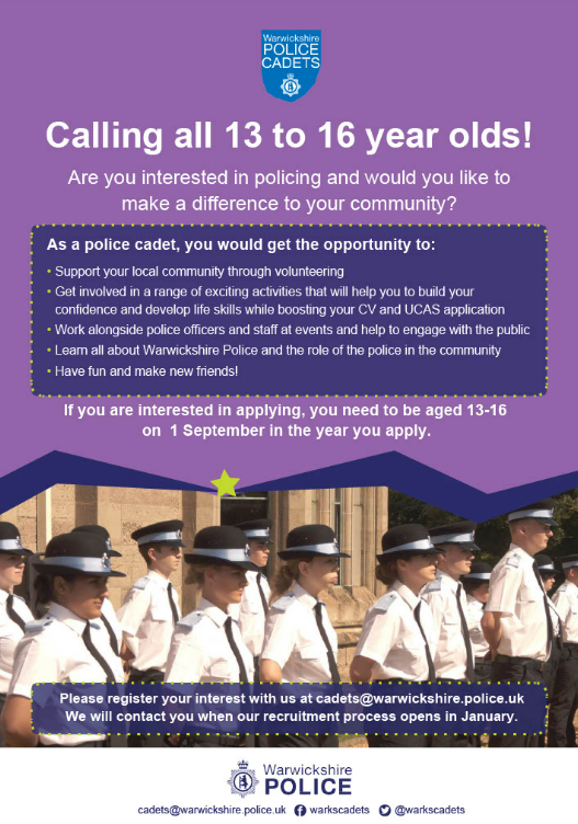 Warwickshire Police Cadets is a volunteer scheme for young people who wish to be part of a year programme that offers an opportunity to gain a practical understanding of policing and develop their spirit of adventure and good citizenship.