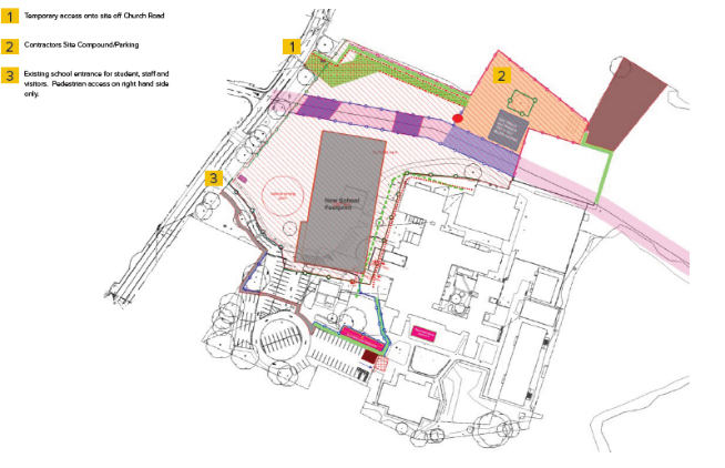 Large vehicles will be restricted to turning right onto site only to avoid the low/weak bridge to the north of Church Road and exiting site to the left. This ensures that Construction traffic is segregated from the existing staff/pedestrian entrance.