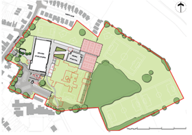 Landscape measures, as shown on the site maps, will be incorporated as part of the overall development. External areas provide open views to proposed playing fields accommodating a football pitch (U11/12) and existing woodland tree canopies. The new frontage to Church Road will be enhanced with additional tree planting between the road and the new building.