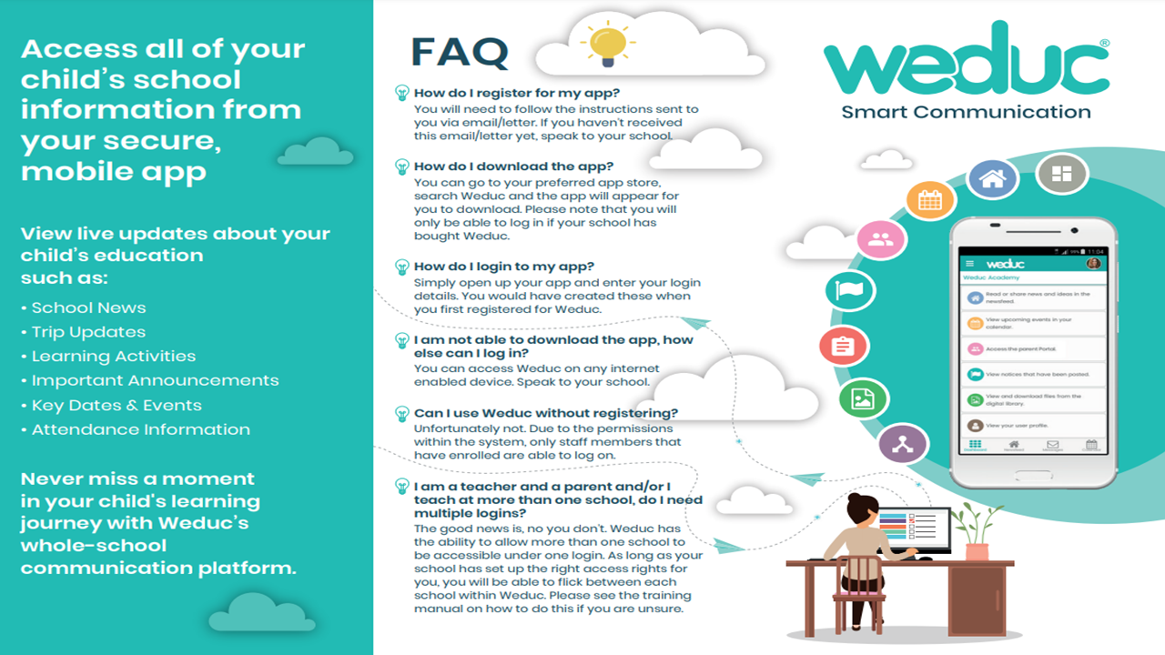 Weduc allows you to see live updates about your child’s education, meaning you will never miss a moment of your child’s learning Journey.  Receive alerts and keep updated with School News, Trips, Learning Activities, Important Announcements, Key Dates and Events, Attendance Information and much more!
