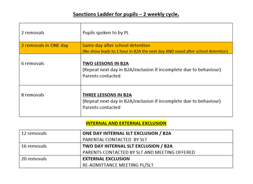 When our pupils do not follow our expectations they will receive a verbal warning, if they continue this leads to a final warning (consequence which is logged). Failure to address their behaviour at this point leads to the pupil being removed to B2A where they will spend the rest of the lesson ‘resetting’ ready for the next lesson. Pupils needing additional support to ‘reset’ will be met by a member of our Pastoral Team. We follow a formal sanction system where repeated removals trigger further sanctions and pupils will complete these either the same day or the following day depending on the sanction.