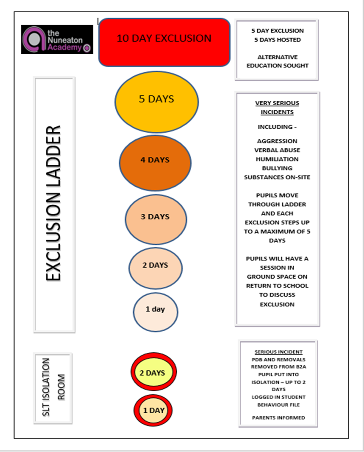 The school only uses internal or external exclusion as a last resort such as (but not exclusively) verbal or physical aggression, humiliation, bullying and substances on site. Each exclusion will be followed by a re-admittance meeting with parents or carers and pupils will be expected to complete a session with the pastoral team to explore the nature of the exclusion and address barriers to full reintegration back into the school community.
